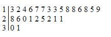 Step 2: Draw a vertical line and write the digits in the tens places from 1 to 3 on the left of the line. The tens digit form the stems.