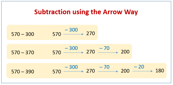 The following diagram shows an example of subtraction using the arrow way. Scroll down the page for more examples and solutions for subtracting using the arrow way.