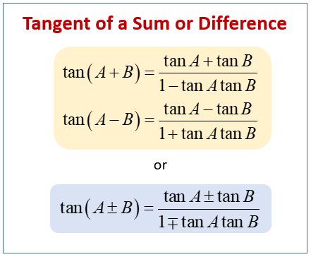The following diagrams show the formulas for the tangent of a sum or difference. Scroll down the page for more examples and solutions for the sum and difference identities for tangent.