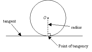 A tangent to a circle is a straight line, in the plane of the circle, which touches the circle at only one point. The point is called the point of tangency or the point of contact.