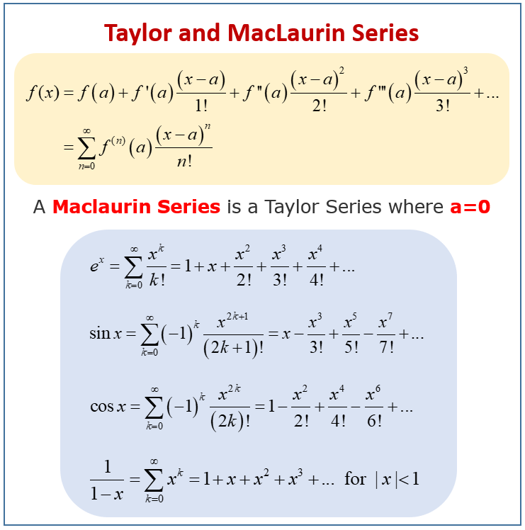 The following diagrams show the Taylor Series and some examples of the MacLaurin Series. Scroll down the page for more examples and solutions using the Taylor Series and MacLaurin Series.