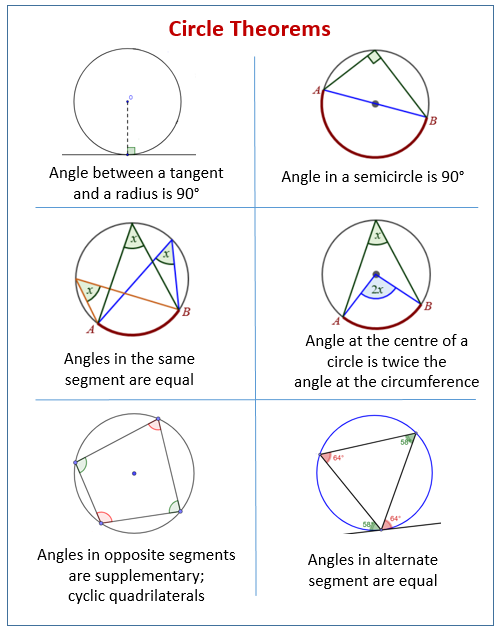 The following diagram shows some circle theorems: angle in a semicircle, angle between tangent and radius of a circle, angle at the centre of a circle is twice the angle at the circumference, angles in the same segment are equal, angles in opposite segments are supplementary; cyclic quadrilaterals and alternate segment theorem. Scroll down the page for more examples and solutions of circle theorems.