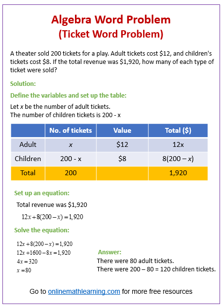 The following diagram shows how to solve a ticket word problem. Scroll down the page for more examples and solutions.