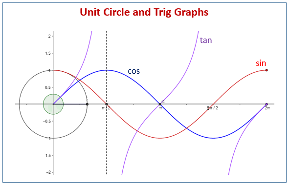 The following diagram shows the unit circle and the trig graphs for sin, cos, and tan. Scroll down the page for more examples and solutions for the sine, cosine, and tangent graphs.