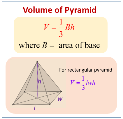 The following diagram gives the formula for volume of pyramid. Scroll down the page for more examples and solutions on how to use the volume of pyramid formula.
