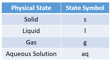 The following table gives the physical states and the state symbols used in chemical equations: solid, liquid, gas, aqueous.